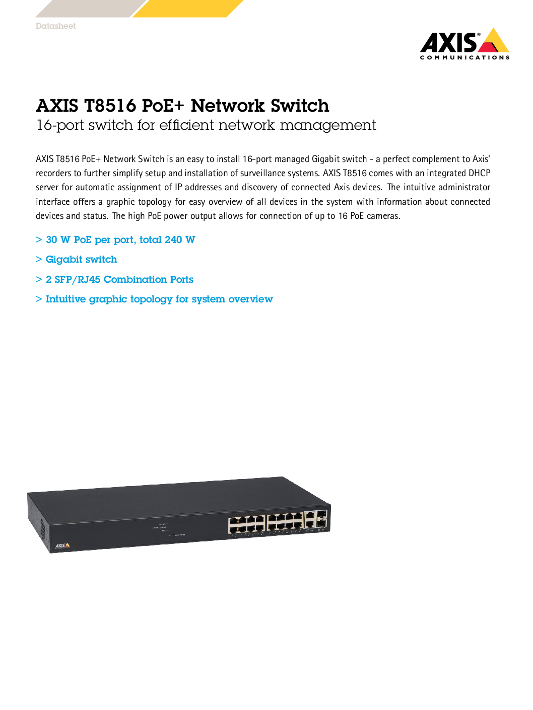 AXIS T8516 16-Port PoE+ switch powers 16 cameras supports SFP uplinks fanless operation and Axis Device Manager for secure scalable video networks NN