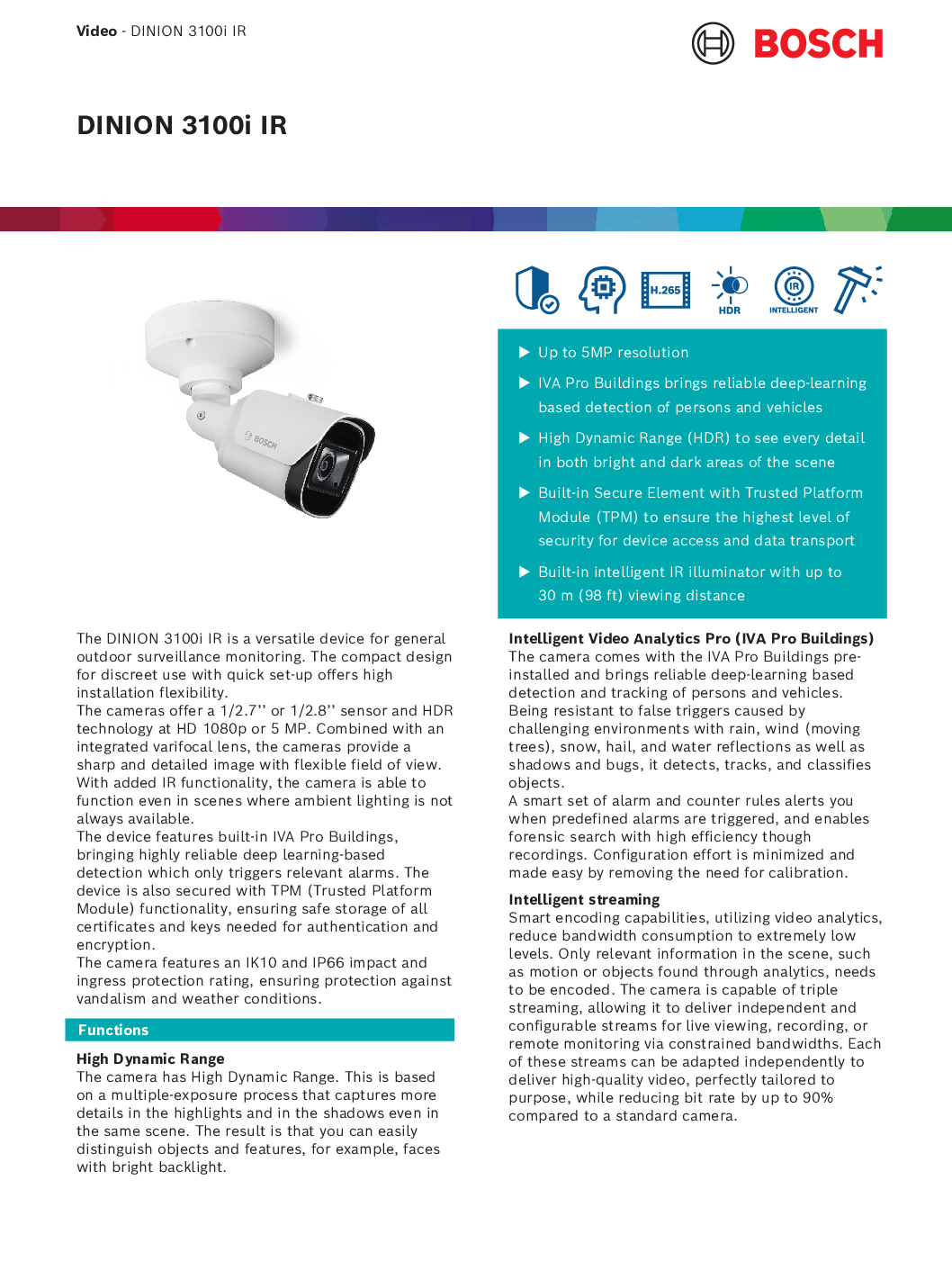 Bosch DINION 3100i CCTV Camera 5mp Bullet IVA Pro deep-learning persons vehicles High Dynamic Range HDR Trusted Platform Module TPM