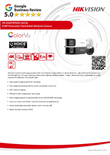 Powered by multi-sensor panoramic imaging, the DS-2CD2T87G2P-LSU-SL offers ultra-wide coverage that reduces camera quantity in open spaces while maintaining forensic-grade image clarity at 8-megapixel resolution. Integrated smart features include motion analytics, human and vehicle filtering (Acusense), built-in speaker, white light deterrent, and direct Hik-Connect mobile app compatibility for remote viewing and event notifications.
