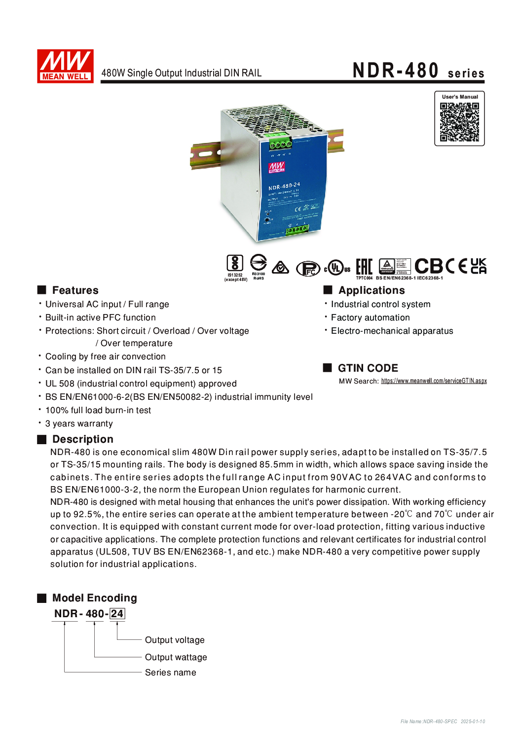 Key Features – MEAN WELL NDR-480-24 Industrial Power Supply