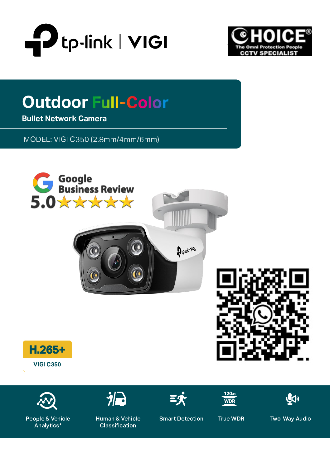 CHOCIECYCLE CCTV offer the best TP-Link 5MP Bullet Camera VIGI C350 SHD FULL-COLOR 24/7 Smart Detection H.265+ Smart Video Enhancement.