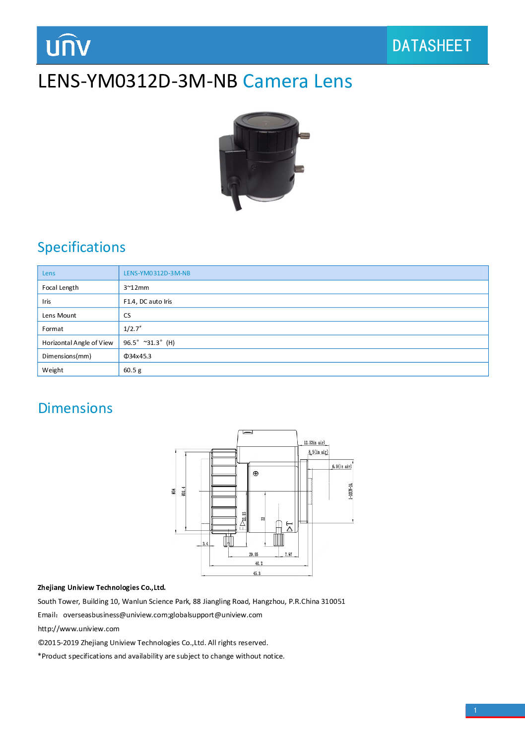 UNV VARIFOCAL LENS Lens-YM0312D-3M-NB $75.00
